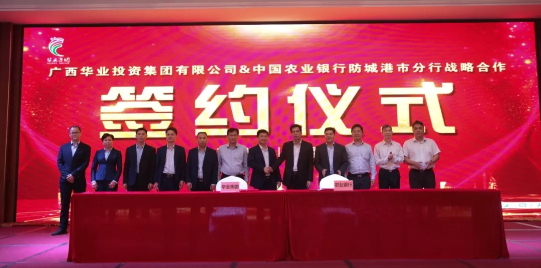 2018年3月28日,廣西華業(yè)投資集團(tuán)有限公司與中國(guó)農(nóng)業(yè)銀行防城港分行在廣西防城港華業(yè)城舉行戰(zhàn)略合作簽約儀式。華業(yè)集團(tuán)董事長(zhǎng)龍其生、龍其偉總裁、副總裁廖人興、副總裁龐樹(shù)玉、副總裁熊昭斐、財(cái)務(wù)總監(jiān)李情,中國(guó)農(nóng)業(yè)銀行防城港分行行長(zhǎng)顏雄、副行長(zhǎng)陳增熙、公司部總經(jīng)理唐健文、農(nóng)業(yè)銀行防城支行行長(zhǎng)劉威、副行長(zhǎng)易成等領(lǐng)導(dǎo)和嘉賓出席了簽約儀式。廣西華業(yè)集團(tuán)副總裁廖人興和中國(guó)農(nóng)業(yè)銀行防城港分行副行長(zhǎng)陳增熙代表雙方簽署了授信60億元人民幣的戰(zhàn)略合作協(xié)議。