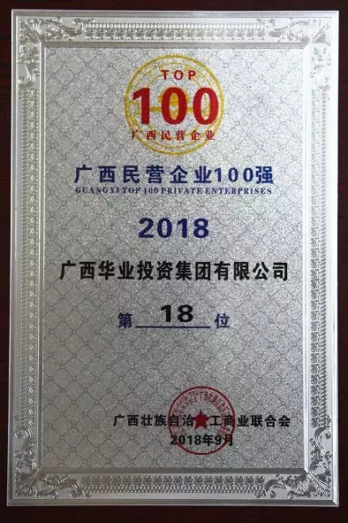 2018年9月29號,廣西壯族自治區工商聯合會主辦的首屆“2018年廣西民營企業100強”發布會在南寧市隆重舉行,本次會議發布了2018廣西民營企業100強、2018廣西民營企業制造業50強、2018廣西最具競爭力民營企業、2018廣西最具潛力民營企業和2018廣西民營企業100強調研分析報告。其中,廣西華業投資集團有限公司榮列第十八名。
