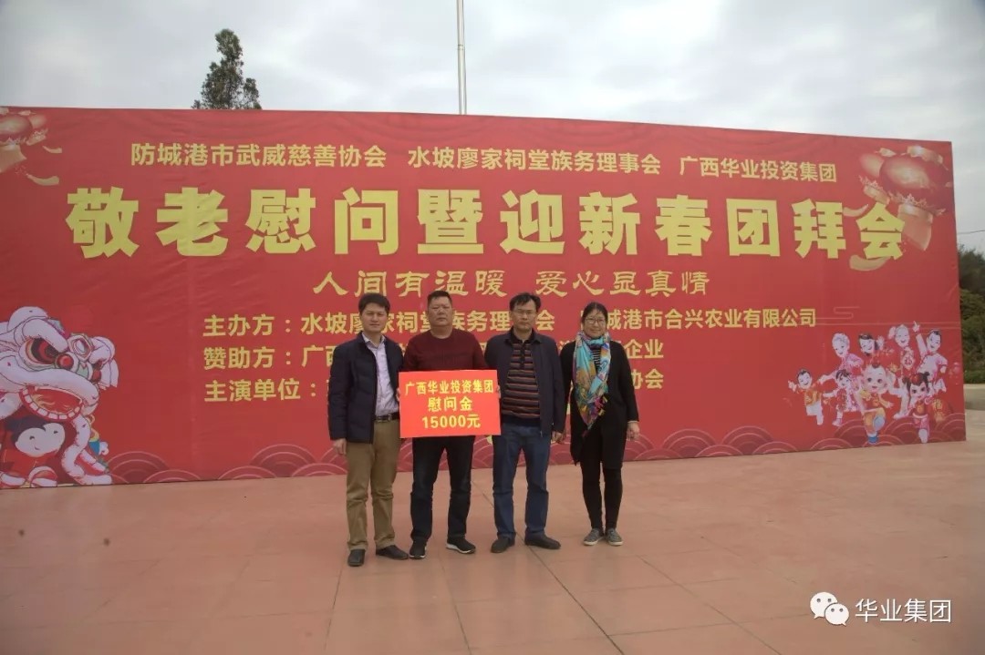 2018年2月4日,在新春佳節(jié)即將來臨之際,廣西華業(yè)投資集團與防城港市武威慈善協會、水坡廖家祠堂常務理事會在灘營鄉(xiāng)石合村舉行了“敬老慰問暨迎新春團拜會”活動,人間有溫暖,愛心顯真情!華業(yè)投資集團副總裁廖人興、副總裁龐樹玉、工會主席鐘麗霞及集團代表參加了此次活動,讓當地群眾過上了一個溫暖的冬季,過一個幸福的春節(jié)。