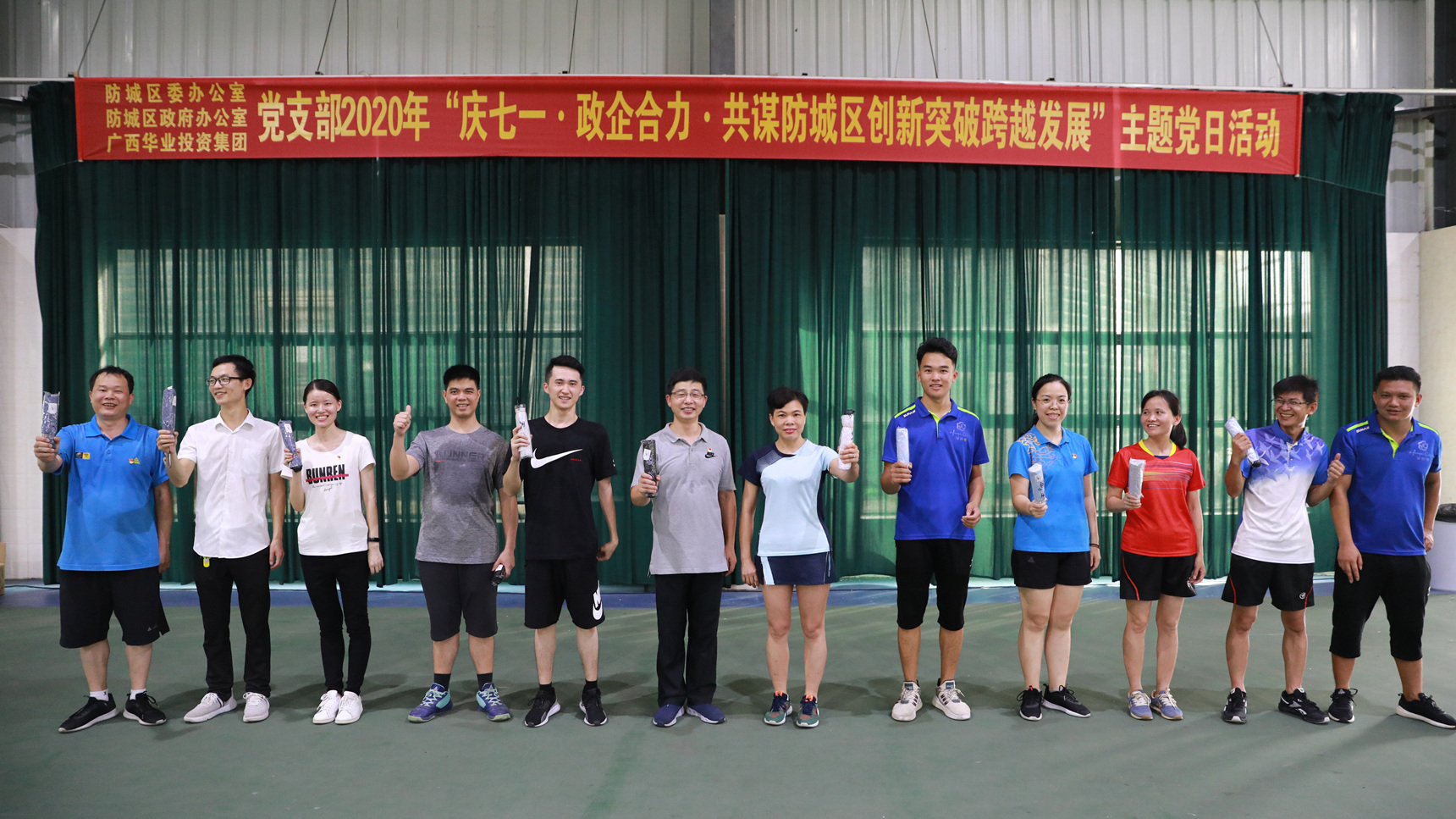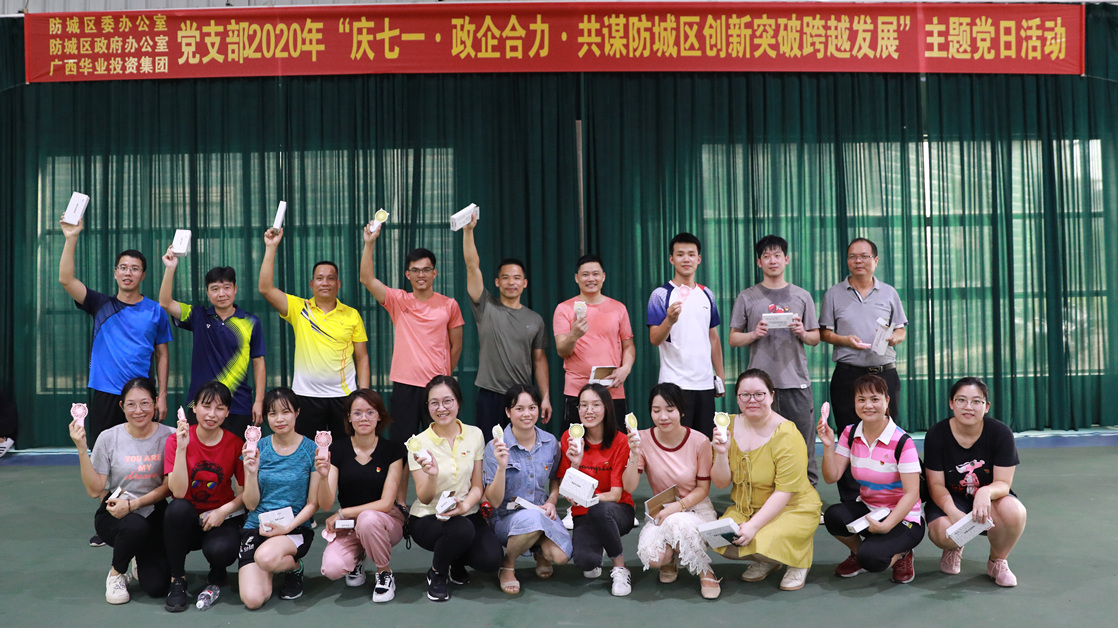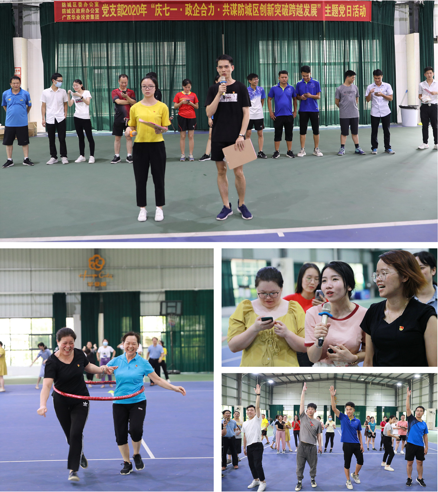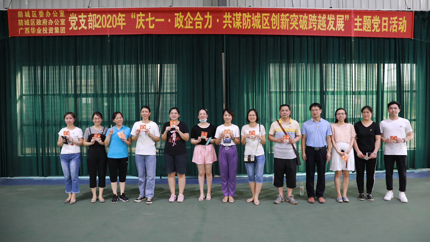 2020年7月3日下午,華業集團黨支部與防城區委辦、政府辦黨支部在華業城聯合開展“慶七一·政企合力·共謀防城區創新突破跨越發展”主題黨日活動。雙方共100多人齊聚一堂,通過參觀黨建展廳、開展黨建知識競答、猜紅歌比賽等黨建活動及氣排球比賽等方式熱烈慶祝中國共產黨成立99周年,為深化政企合作,推動防城區創新突破、跨越發展貢獻力量。
