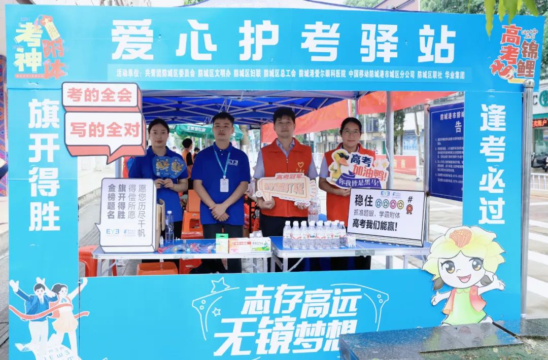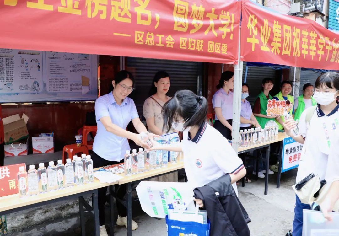 6月7日上午,華業集團工會主席鐘麗霞率公司員工前往防城區各個考點布置愛心護考驛站,為考生及家長免費提供飲用水、紙巾、文具包、應急藥品等為高考加油助力。