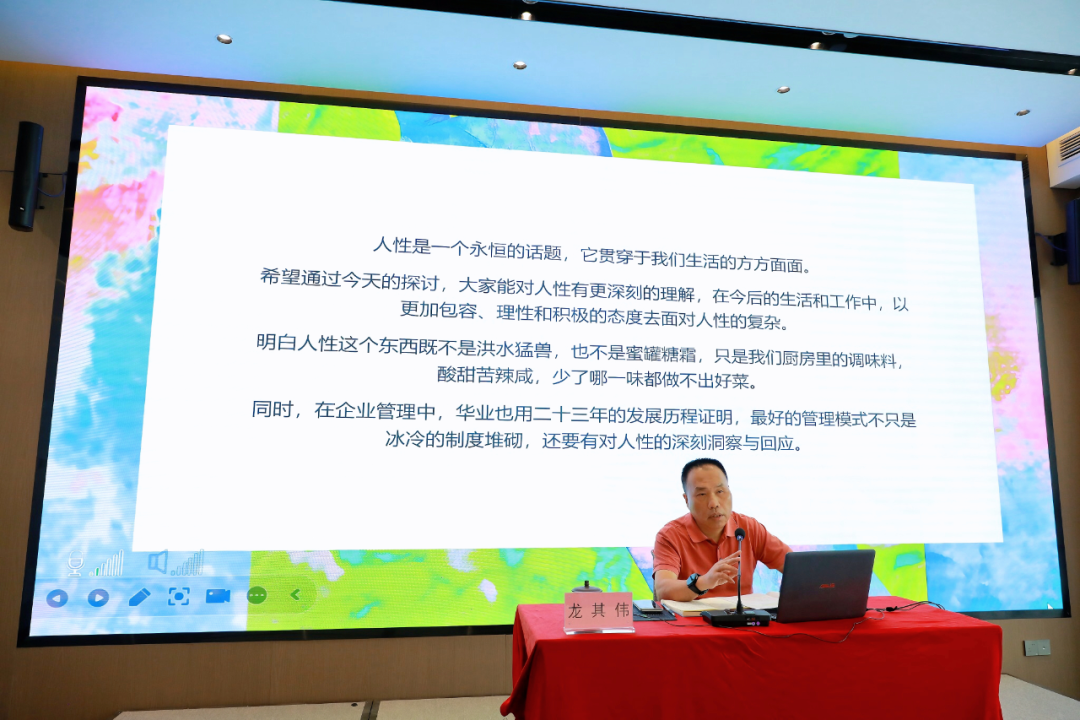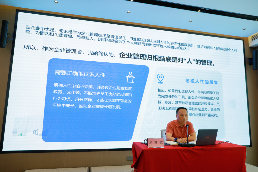 培訓中,龍其偉總裁以“人性與企業管理”為主題,通過分享視頻和生動事例解碼人性本質,指出人性是生物本能與社會屬性交織的復合體,既包含趨利避害的生存本能,又蘊含向善求真的精神追求。