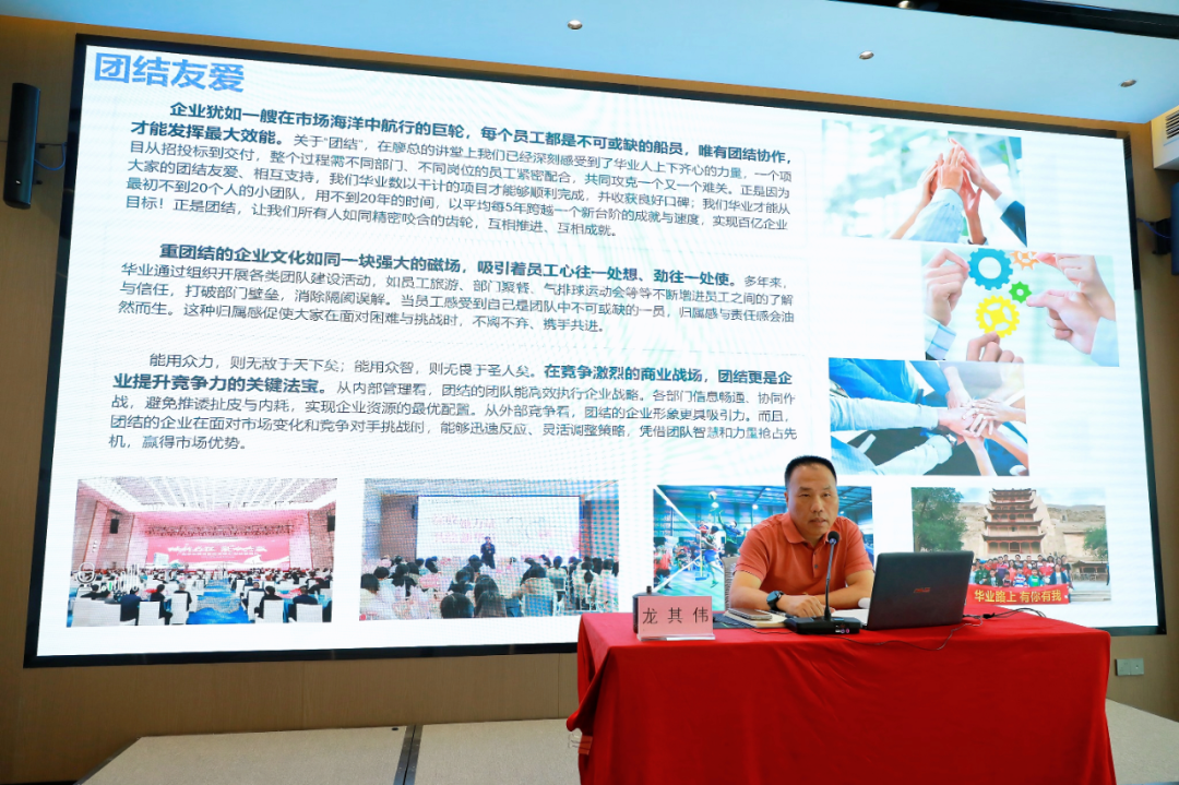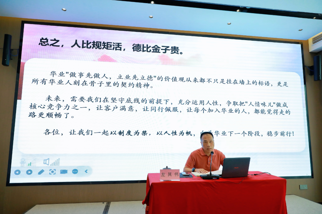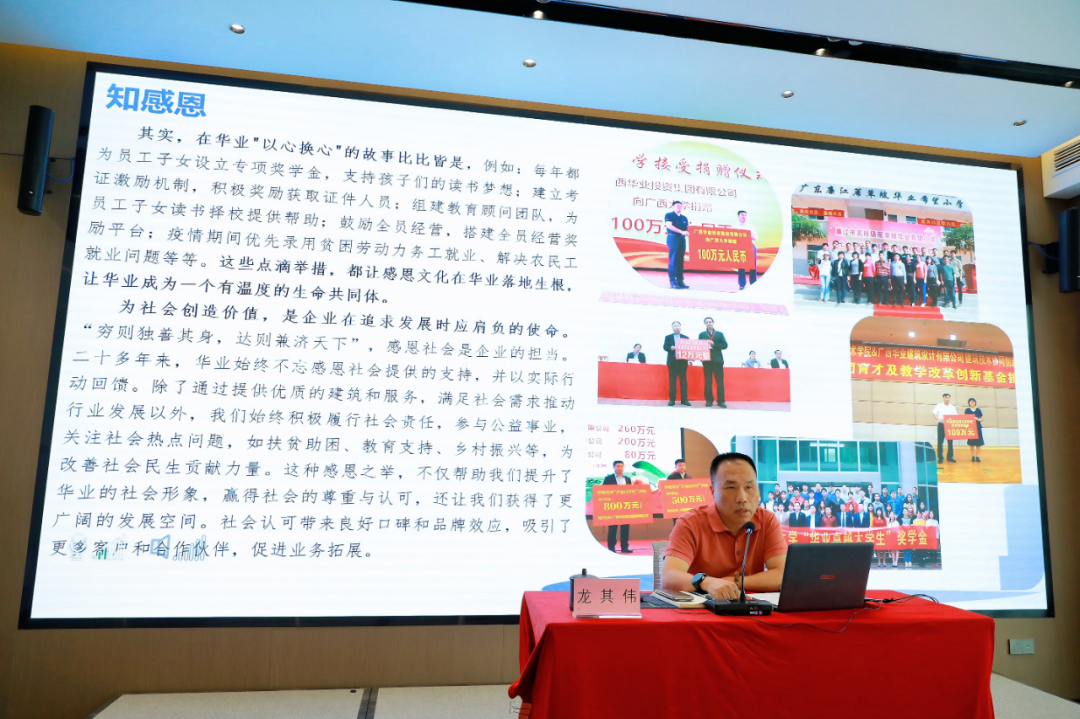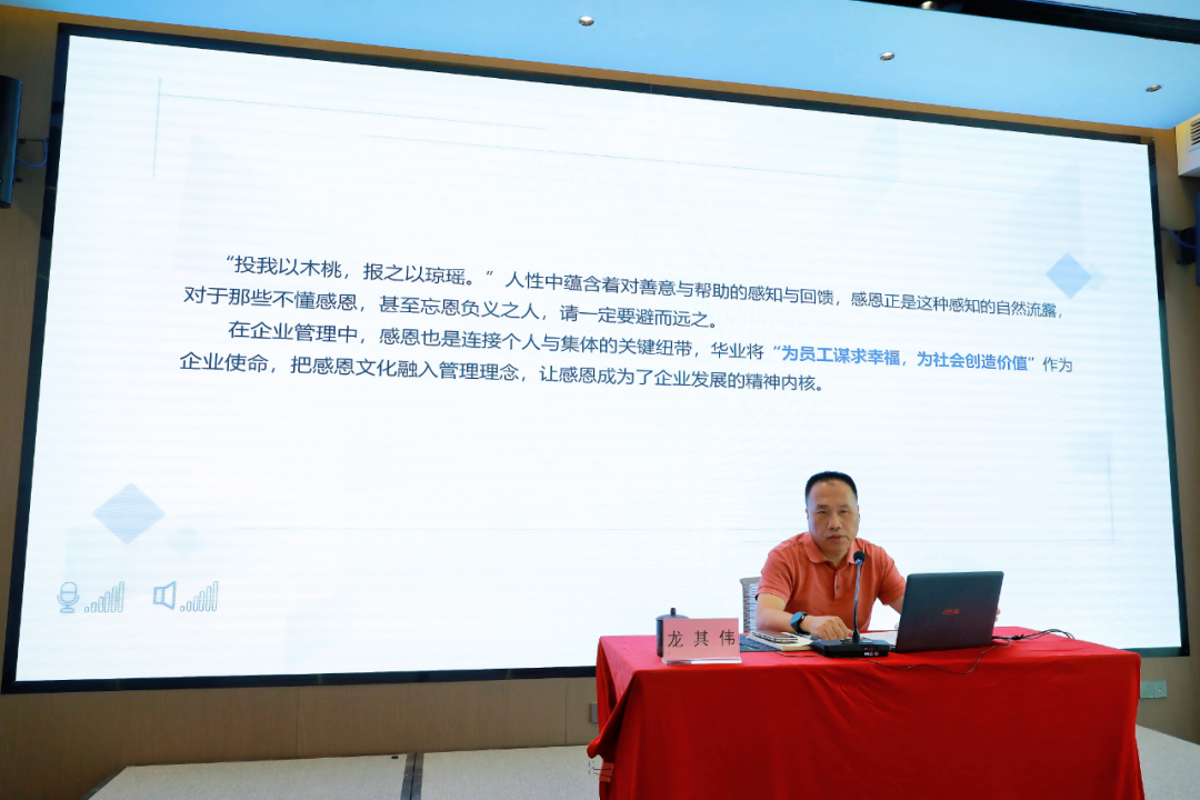在“人性與企業管理的融合”篇章,龍其偉總裁強調企業管理歸根結底是對“人”的管理。他結合集團實際,與大家分享華業如何通過“守信用、講道德、知感恩、重團結”四大基石構建具有華業特色的人性化管理體系。